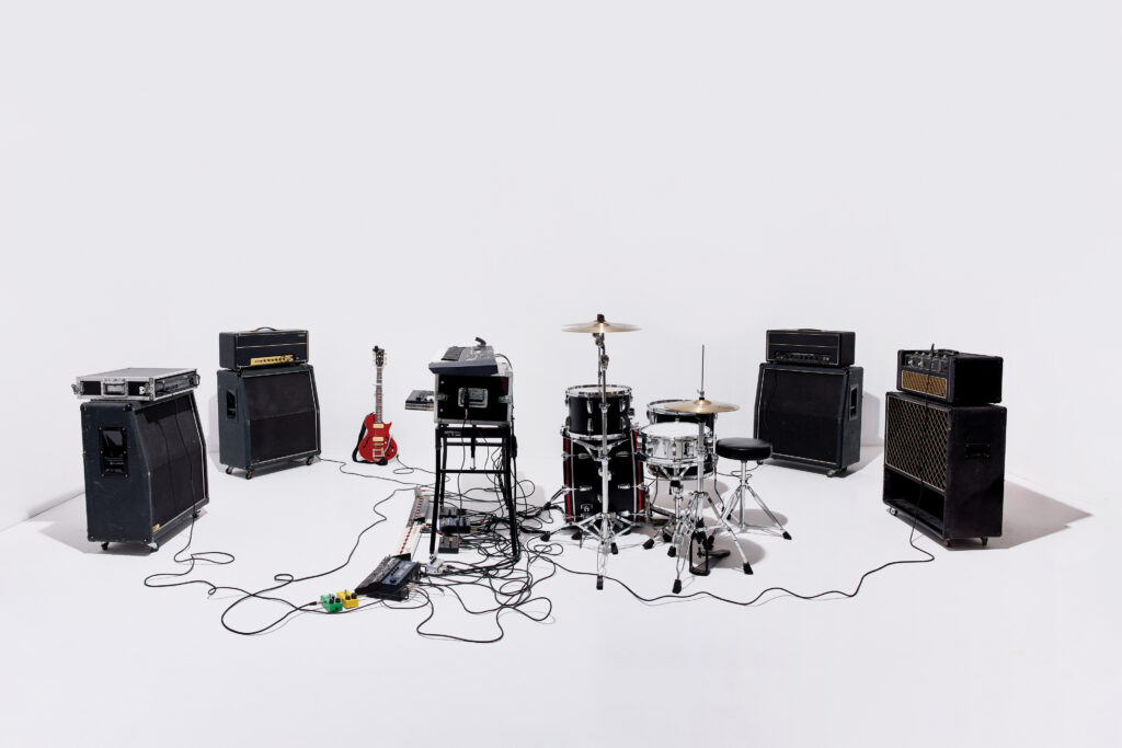 À rebours du format classique guitare-basse-batterie, le duo développe un système quadriphonique dans lequel la guitare transite par quatre amplificateurs disposés autour de la batterie. Cette configuration, ne nécessitant qu’une simple alimentation électrique, leur permet d’investir tout type d’espace. La musique qui en découle privilégie l’impact physique et la spatialisation : un minimalisme rythmique et résonant qui fonctionne autant comme une architecture sonore que comme un concert.