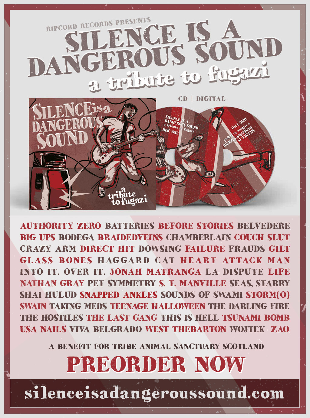 Le label Ripcord vient de sortir une compilation hommage à Fugazi, avec pas moins de 43 participants dont Failure, Couch Slut, Big Ups, Shai Hulud, Jonah Matranga, La Dispute, Storm(o), USA Nails, Zao, Tsunami Bomb, Chamberlain, Swain, Viva Belgrado… La totalité des profits de cette sortie (vendue en CD et numérique sur bandcamp ou ici) sera reversée à l’association Tribe Animal Sanctuary Scotland (tribesanctuary.co.uk).