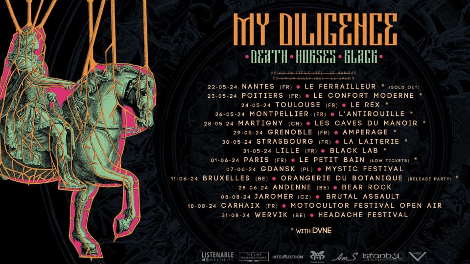DEATH.HORSES.BLACK, le nouvel album du groupe post-metal belge My Diligence, vient de sortir via Listenable Records. Il a été enregistré au studio Sainte-Marthe à Paris par Francis Caste (Hangman’s Chair, La Chaise du Pendu, Regarde les Hommes Tomber…).
