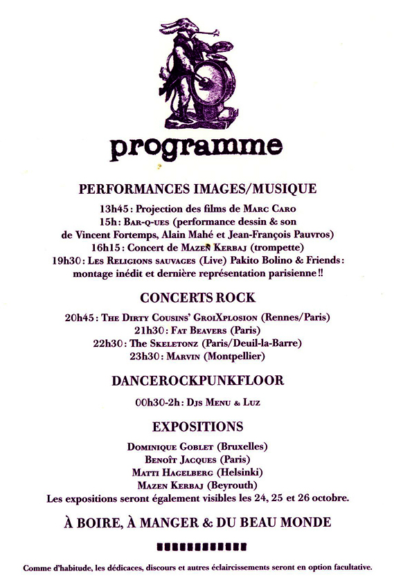 A l’occasion de la fête pour l’Assemblée Générale de la maison d’édition de bandes dessinées l’Association, le trio montepellierain Marvin (Noise De-voluée) jouera ce soir vers 23h30. C’est gratos, et ça n’est pas tout. Au programme: expos, concerts (Skeletonz, Fat Beavers), performances (Jean-François Pauvros, Pakito Bolino), DJ-ing (Luz), projections vidéos…