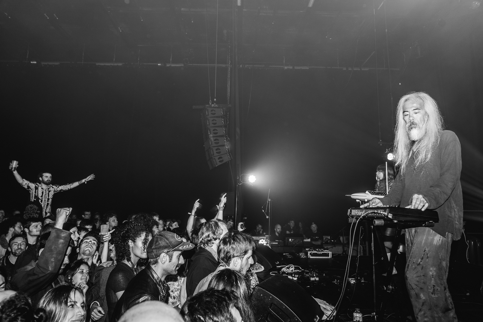 Dans un autre genre, l’excellent duo anglais The KVB permet de poursuivre notre chevauchée fantastique embrumée au pays du psychédélisme, cette fois en contrée cold cave, avec une musique menaçante, mystérieuse et propice à la satellisation immobile. Sous un light show laissant à l’imaginaire de l’auditeur tout le loisir de vagabonder, le duo mixte guitare/chant + synthés/boîte à rythmes prouve de manière éclatante qu’il sait créer des atmosphères puissantes. Les guitares languides et réverbérées à la Robert Smith, la voix inquiétante, les synthés lugubres, tout est fait pour que le public plonge tête la première dans ce délire délicieusement froid et morbide. À signaler, une très bonne reprise du « Sympathy for the Devil » des Rolling Stones. Très attendue, la prestation de Group Doueh & Cheveu ne déçoit pas, bien au contraire, puisque la fusion des deux troupes opère parfaitement et donne vie à un punk Lo-Fi mâtiné de blues du désert assez unique. Certains titres vont même jusqu’à se révéler « tubesques », comme l’imparable et bien nommé « Tout droit ». Un peu plus tard, la tête d’affiche du jour, Slowdive emmène ses très nombreux fans sur son petit nuage shoegaze, un endroit peuplé de morceaux tous plus planants, trippants et stimulants pour la psyché les uns que les autres. Comme lors de ses prestations mémorables à La Route du Rock et au This Is Not A Love Song il y a quelque temps de ça, le quintette anglais, auteur d’un nouvel album assez miraculeux, arrive à faire prendre l’escalier qui mène au paradis avec ses montées de guitares sursaturées et truffées d’effets stellaires. Toujours illuminés par les voix de Rachel Goswell et Neil Halstead, les morceaux se révèlent de jouissives bandes-son pour des vols planés soniques euphorisants. Et ce qu’ils soient récents, comme le génial « No Longer Making Time », ou cultissimes, comme l’immense « When the Sun Hits » (qui peut s’écouter des milliers de fois en faisant toujours battre le cœur aussi fort). Magique ! Déjà passablement enthousiasmé par cette première salve de concerts, on prend ensuite de plein fouet la prestation hallucinante et hallucinée des grands malades d’Acid Mothers Temple, un gang de Japonais s’y entendant pour faire monter une sorte de mayonnaise kraut noise space-rock chamanique ayant la particularité de faire foutrement tourner la tête. Noyé au milieu d’un maelstrom de bruits sidérants, l’auditeur n’a d’autre choix que de headbanguer au milieu de ses congénères, eux aussi en partance vers d’autres sphères. Dans ces conditions extrêmes, le (pourtant très court) trajet de retour va s’avérer un peu compliqué.
