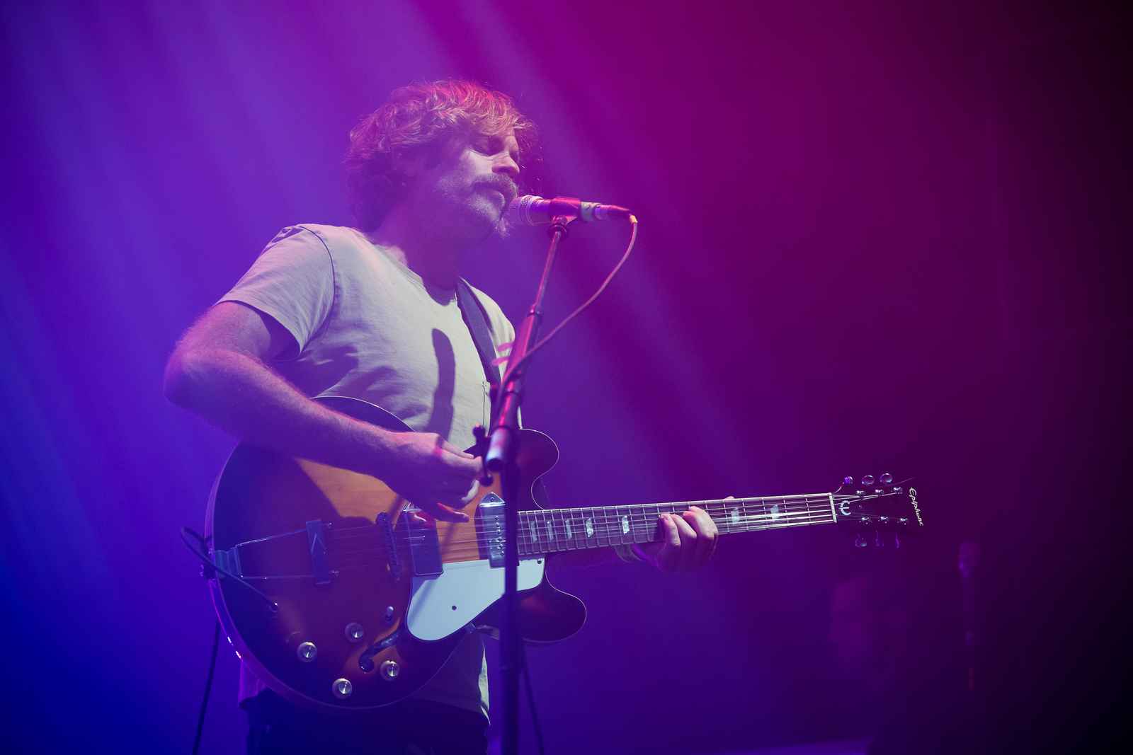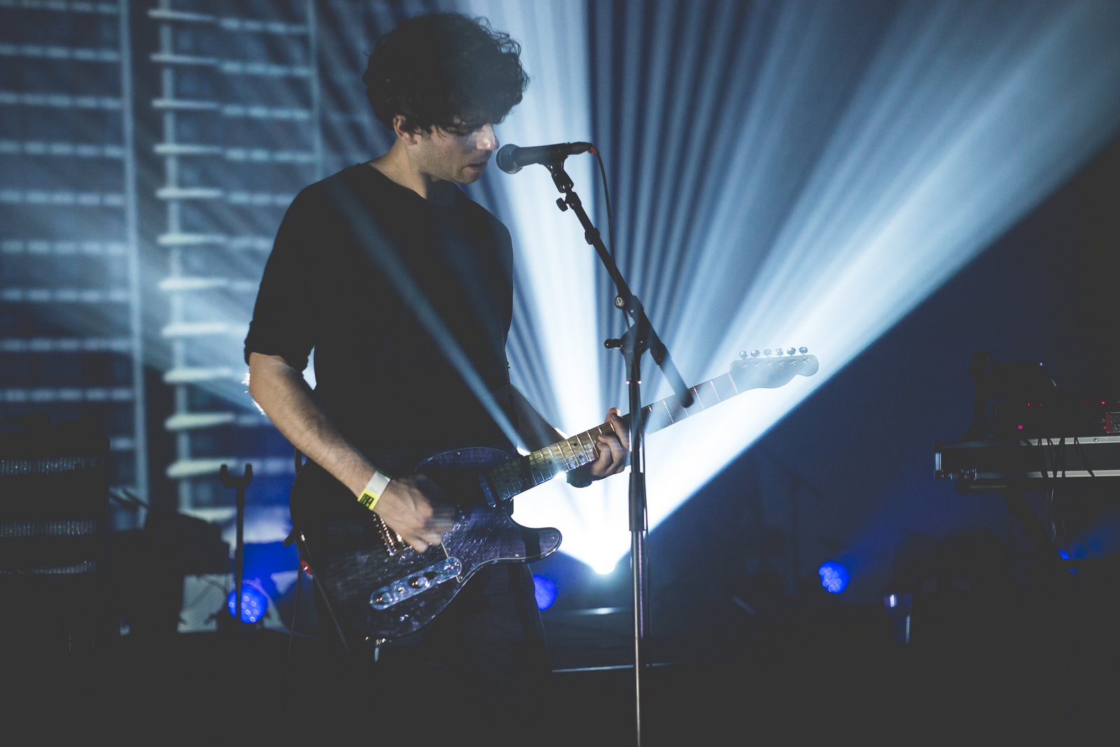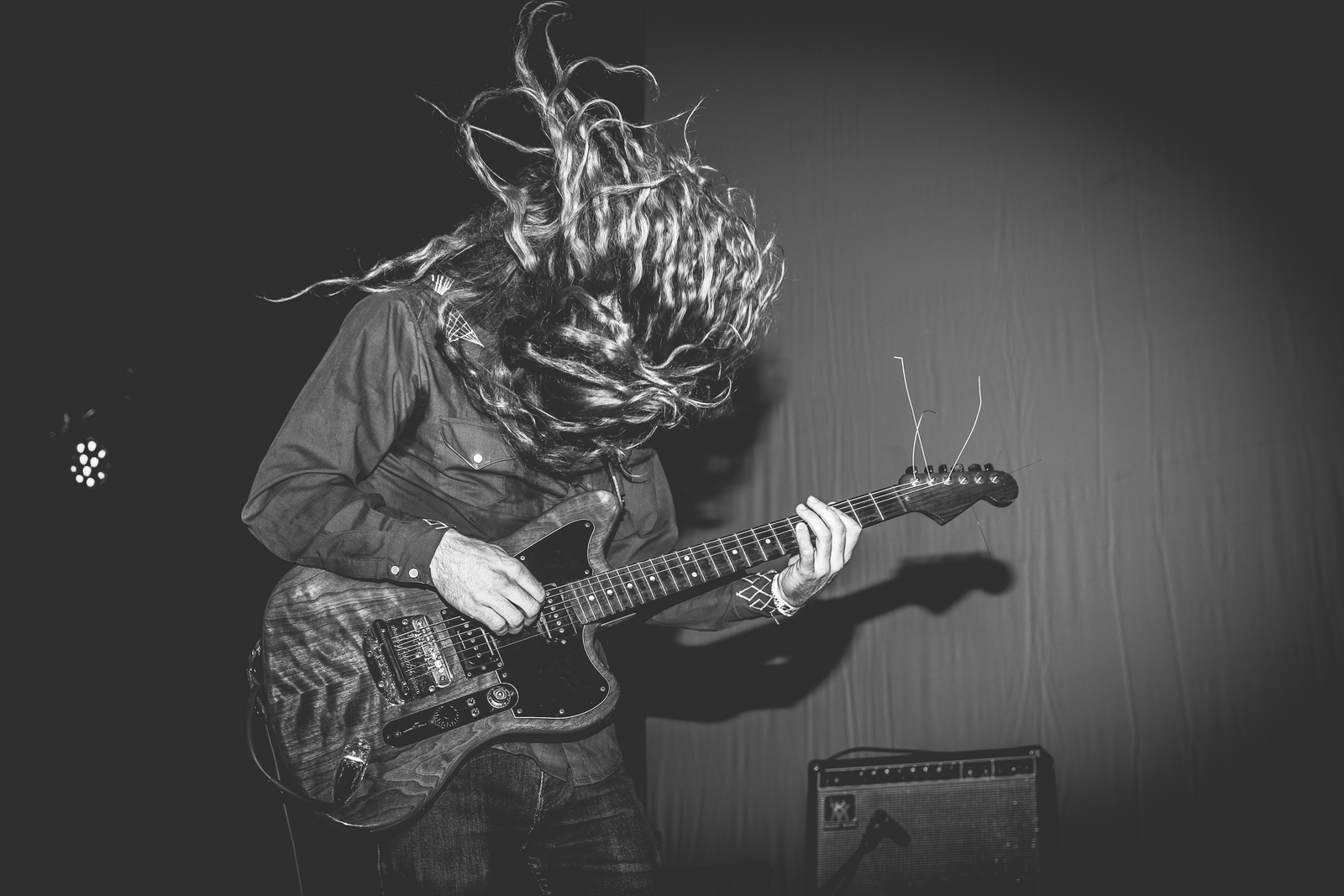 Bonne idée des Black Angels d’avoir choisi les New-Yorkais comme première partie de leur tournée. La troupe venue d’Austin poursuit quant à elle les débats sur la grande scène avec un set best of de presque deux heures composé de plusieurs titres du très bon dernier disque, Death Song (« Currency », « Life Song », « I Dreamt », « Grab as Much (as you can) »…), ainsi que de nombreux classiques extraits des albums précédents (« Bad Vibrations », « Entrance Song », « Science Killer », « Young Men Dead »…). Peu causants comme à leur habitude mais très bien soutenus par des projections bluffantes, Alex Maas & Co placent leurs fans sur une magnifique rampe de lancement : ceux qui ne slamment pas ou ne headbanguent pas passent l’intégralité du show les yeux fermés, complètement dans leur monde. Sans doute partis en goguette vers une lointaine destination inaccessible sans sa bande-son psychédélique jouée en direct live.