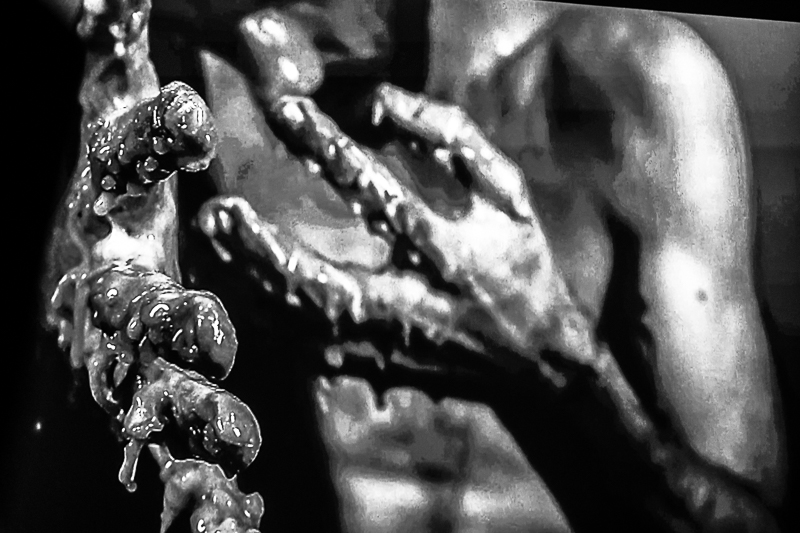 On poursuit la mise en jambe avec le set baptisé Rejet : chapitre 1 & 2 de Treha Sektori, soit le projet dark ambient en solo du musicien/graphiste/photographe parisien Dehn Sora (qui a beaucoup travaillé avec Blut Aus Nord et Amenra, et dans une moindre mesure PNL), également convié à Tilburg pour jouer avec son groupe black metal Throane et son autre groupe à-la-Cult-Of-Luna, Ovtrenoir. Alors que l’on passait juste voir ce que ça pouvait donner en live et malgré une certaine difficulté pour rentrer dedans de prime abord, on restera finalement toute la durée du set. Parce qu’une fois bien immergé dans cette dark ambient aussi physique qu’organique, aux basses profondes et aux effets de souffle qui font violemment trembler le bord de scène et les cages thoraciques, la performance de ce perfectionniste touche-à-tout se révèle suffisamment prenante et immersive pour donner l’envie de prolonger le voyage en eaux troubles, quelque part entre Bad Sector, Tribes Of Neurot (surtout pour les percussions que viendront dispenser deux encagoulés) et les morceaux les plus languides d’Author & Punisher. Surtout que les vidéos projetées sont particulièrement soignées, pensées et conçues en même temps que les morceaux joués cette après-midi, eux-mêmes divisés en rituels et nouvelles récitant ces chapitres 1 & 2. On ne sait pas trop s’il existe une réelle narration, puisque les mots étaient plutôt murmurés, susurrés, passés dans des filtres, mais on imagine que oui. Bien plus intéressant en live que sur disque, très bonne surprise.