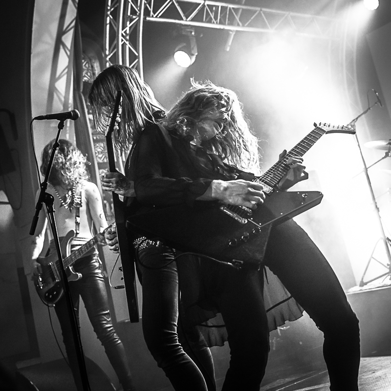 On enchaine avec le concert qui nous aura sans doute donné le plus envie de gueuler « Sooo fuckin’ metal ! » de tout le week-end. Programmés par Tomas Lindberg et une de nos énormes révélations de ce fest, les danois de Slaegt n’en finissent plus d’embellir notre quotidien avec leur mix parfait de black metal proggy, de death’n’roll très Carcassien et de heavy metal pur jus extrait de la NWOBHM. A contrario de leur style musical qui trouve quand même ses racines dans le black le plus pur (voir leur premier album, Ildsvanger, sorti sur Posh Isolation en 2015), sur les photos promos, le groupe s’affiche dans un look poseur décomplexé qui n’est pas sans rappeler Manowar ou la sortie de route glam de Celtic Frost (période Cold Lake donc). Ce soir, les quatre danois montent sur scène fringués à l’avenant, transposition visuelle parfaite du premier titre joué, le percutant « Perfume & Steel ». Tous portent des peaux de bêtes (de l’agneau, je dirais, pour la souplesse et le velouté) en cuir marron: chemise généreusement ouverte jusqu’au nombril pour le soliste (muni d’une Gibson Explorer qu’il brandira au-dessus de sa tête la moitié du set), veste sans manche pour le chanteur-guitariste (Flying V en mains) et futal moulant négligemment porté sous un torse nu mais glabre pour le jeune bassiste. Ajouter à ces attributs 100% metal, une importance non négligeable du cheveu et vous obtenez la quintessence même du genre qui fera fuir tous les allergiques aux hardos et autres traumatisés du hair metal. Fatale erreur. Parce que ce groupe trouve ses origines dans un BM certifié, que l’on ne distingue pas une once de glam, ni même de hard FM dans leur musique malgré des accroches mélodiques sans faille, et que les fans de Carcass (dernière période) ou de Tribulation devraient s’en délecter, sans oublier tous les fanas d’épopées métallique basées sur les cavalcades homériques, les chorus racés et les duels guitaristiques de haute volée qui ne sont pas réservés aux seuls fans de Maiden, Judas et consorts : d’Undying à Vektor en passant par The Sword ou Anaal Nathrakh, le périmètre est assez large pour y trouver son compte et rassembler pas mal de monde. En bref, si vous ne sentez pas le Malin vous chatouiller les orteils à l’écoute de « Domus Mysterium » (le morceau comme l’album du même nom), du fabuleux « I Smell Blood » (au solo caressant le pinacle de l’orgasme heavy metal) ou de l’hallucinant « V.W.A. », c’est que vous êtes mort, cul de jatte ou paraplégique, ou en passe de rapidement devenir l’un ou l’autre, allez consulter !