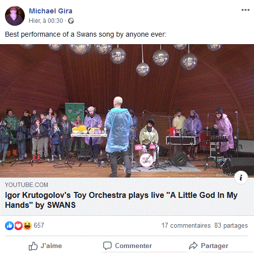 Ci-dessous vous pouvez écouter « A Little God in My Hands » des Swans jouée en partie par des enfants avec des instruments-jouets . Ce qu’en pense Michael Gira ? Que du bien apparemment.