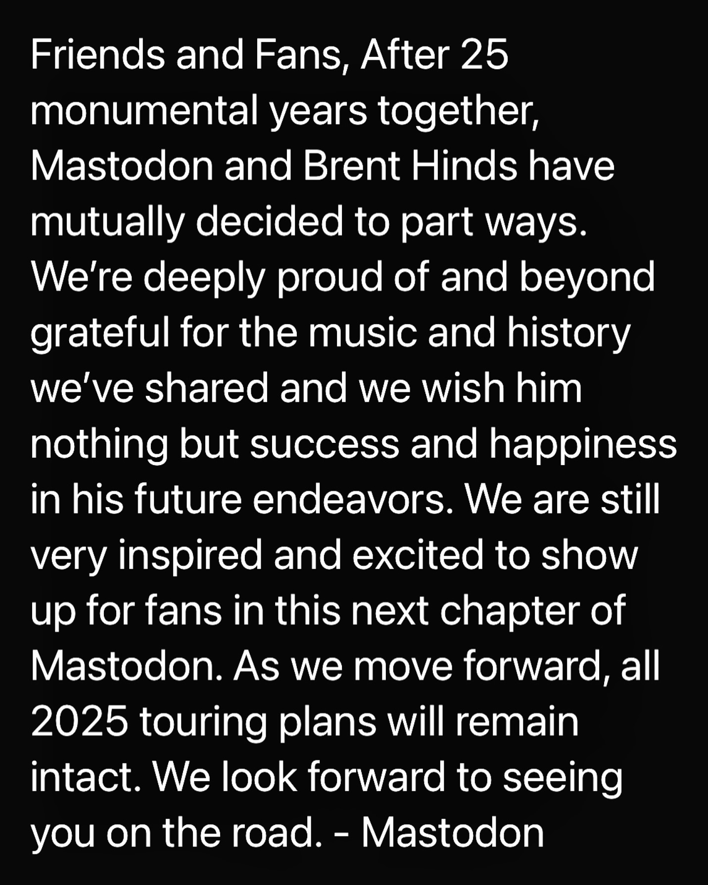 Nous sommes profondément fiers de la musique et de l’histoire que nous avons partagées et nous ne lui souhaitons que du succès et du bonheur dans ses projets futurs. Nous sommes toujours très inspirés et motivés par ce nouveau chapitre de l’histoire Mastodon. Tous les plans de tournée pour 2025 restent inchangés. Nous avons hâte de vous voir sur la route. »