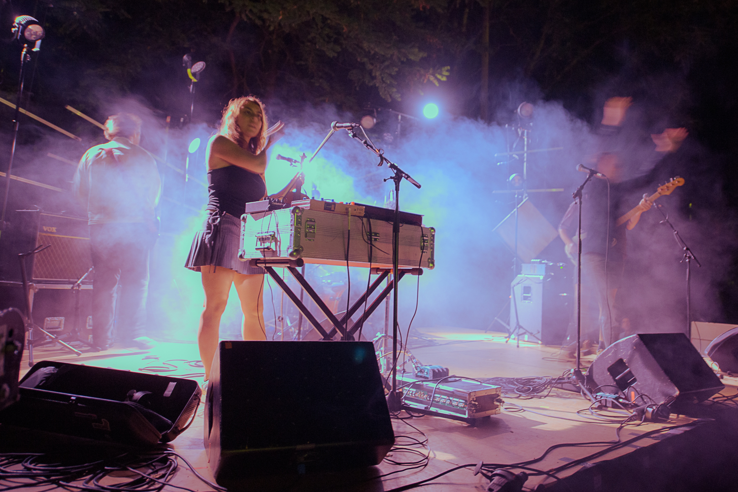 Le noise rock n’est d’ailleurs pas non plus oublié dans ce parcours à la fois nonchalant et chaotique, aussi zigzagant que le ballet des kayaks fondant sur le Tarn en contrebas. Dans le sillage de Wasteland: What Ails Our People Is Clear, leur premier album de 2021, et en attendant la sortie de Third Time At The Beach, prochainement sur AD93, le label de Moin, les Bristoliens de Lice démontrent la bonne santé de la facette la plus versatile de la nouvelle scène post-punk anglaise, incarnée par les Squid, Geordie Greep/Black Midi ou Snapped Ankles. Porté par un trio basse-guitare-batterie augmenté d’une violoniste/préposée aux machines scellant la dimension expérimentale de leur musique, Lice conserve tous les atours d’une formation rock-noise déjantée, même si elle gonfle sa besace d’aspérités électroniques et de chausse-trappes harmoniques ou stylistiques. Le remuant – et amateur d’autotune – vocaliste Alistair Shuttleworth s’échine à cornaquer le public en ce sens, le guidant, assez maladroitement d’ailleurs, vers d’audacieux wall of death et circle pit pour fêter le 200e show (et le premier headline dixit ce dernier) de leur carrière. Des efforts répétés qui finissent pourtant par payer auprès de l’assistance bon enfant – en particulier la personne qui se propose à balader le chanteur sur ses épaules – quand un pogo croquignolesque s’ébroue sur le revigorant « Conveyor ». Un prélude paroxysmique au long final en larsen sur le mur d’amplis en façade que le groupe guide depuis l’arrière de la scène.