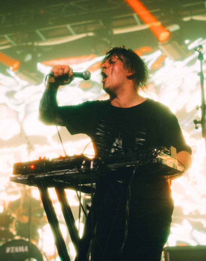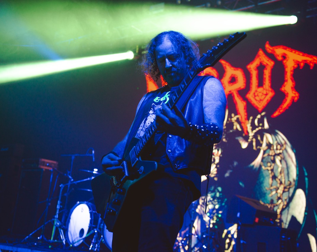 On sera un peu moins prolixe sur le groupe suivant, car nous sommes surtout allés voir Perturbator par curiosité, n’ayant jamais eu l’occasion de le voir en salle, et aussi pour patienter en attendant Corrosion Of Conformity. Cela fait maintenant plus d’une décennie que James Kent fait gambader le petit monde des musiques sombres, accomplissant au passage une véritable œuvre de conservation patrimoniale en remettant de la hype sur la synthwave – avec des artistes comme Dan Terminus, Gost, également programmé ce samedi, et heavydemment Carpenter Brut –, tout en la faisant s’interpénétrer avec le monde des musiques extrêmes : louable entreprise ! N’étant ni hostile ni particulièrement client du genre, et plutôt ouvert par ailleurs aux musiques électroniques, nous avions des attentes mesurées à propos de ce concert, et, in fine, nous avons passé un excellent moment à danser sur ses tubes certes électro/synthwave, mais aussi ponctuellement parés d’atours plus gothiques/cold wave. On comprend, à la lumière de lectures postérieures, qu’il s’agit d’influences ayant affleuré sur ses disques les plus récents, et si ces styles sont moins notre came que le reste de ceux peuplant son univers, force est de reconnaître que ces inclinaisons plus froides viennent agréablement compléter et équilibrer le reste de son arsenal dansant. Bref, c’était très bien, et il aurait sans doute même été plus judicieux, en termes de montée en puissance de la soirée, d’inverser le festif Perturbator avec la daronnade NOLA qui lui a succédé une heure plus tard.