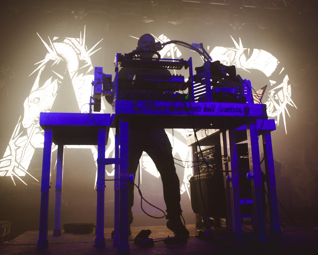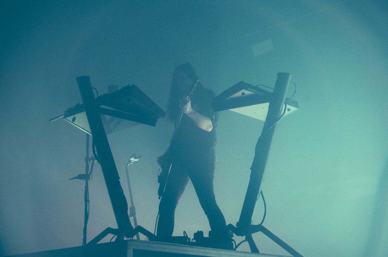 La fin de cette deuxième et dernière journée se profile doucement, et tant nos lombaires que nos petits petons réclament justice. Notre foie, pour sa part, demande la paix des ménages : nous assumons donc de remplacer les grosses pintes – qui font ici un litre, un tonnage quasi comique qui nous permet d’observer, circonspects, des quadragénaires britanniques s’envoyer seuls de l’ale tiède par litrons – par un bon vieux chai latte au lait végétal des familles. C’est aussi l’occasion d’aller poser nos miches endolories à quelques mètres de la scène où officie l’ingénieur en mécanique sonore industrielle Author & Punisher. Nous ne l’avions encore jamais vu, malgré ses nombreux passages en France, pour la simple et bonne raison que si sa musique nous a souvent intrigués et intéressés, elle ne nous a jamais totalement emportés : trop lente, trop ambiante et atmosphérique, malgré une réelle capacité à cracher le feu d’un metal industriel martial et bourré d’identité — rappelons d’ailleurs que le bon Tristan Shone construit lui-même l’immense majorité de ses drone machines, qu’il opère sur scène, effet visuel garanti, d’autant plus qu’il est désormais accompagné d’un guitariste. Mais la curiosité ne fait pas tout, et, fatigue aidant, nous devons bien reconnaître que nous peinons à nous laisser embarquer dans le Shone-Verse, malgré un très chouette dernier disque, Nocturnal Birding, dont il joue, sauf erreur de notre part – ou à moins que nos oreilles ne soient déjà saturées de dry stout, ce qui, à ce stade du week-end, demeure tout à fait possible –, la quasi-totalité.