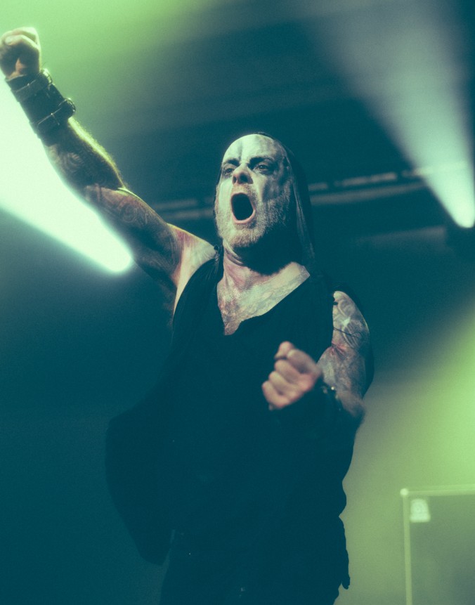 Les concerts de black metal se suivent en ce dimanche, mais ne se ressemblent pas, puisque cette fois nous assistons à une version speed metal/thrash old school du genre avec Hellripper. Notre rapport au groupe est particulier : nous le trouvons tantôt imparable, tantôt redondant, tout dépend vraiment des morceaux sur album et des setlists proposées en concert. Les Écossais démarrent sur les chapeaux de roues – ont-ils déjà fait différemment ? – avec l’hymne « All Hail The Goat », repris à gorge déployée par le public. Ils poursuivent sur l’EP Black Arts & Alchemy avec le morceau-titre, afin de rester dans le ton. Le son est toujours bon, l’interprétation sans faille, l’énergie démentielle, et le retour du public tonitruant. C’est avec « Goat Vomit Nightmare » que le groupe commence enfin à interpréter des morceaux de Warlocks Grim & Withered Hags, que nous considérons comme le pinacle, à ce jour, de leur discographie. Le 22 octobre dernier, le quintet a dévoilé un nouveau single, « Kinchyle (Goatkraft And Granite) », qu’il interprète ensuite afin d’offrir un peu de nouveauté au public. Le morceau est très agréable, mais n’apporte pas d’énergie véritablement nouvelle à la musique des Écossais. Aucun autre extrait de Warlocks n’est joué, pas même le puissant « I, The Deceiver », qui aurait pourtant trouvé sa place dans une setlist devenue un peu trop homogène sur les vingt dernières minutes. Dommage : au final, cette prestation n’est pas la meilleure que nous ayons vue d’Hellripper.