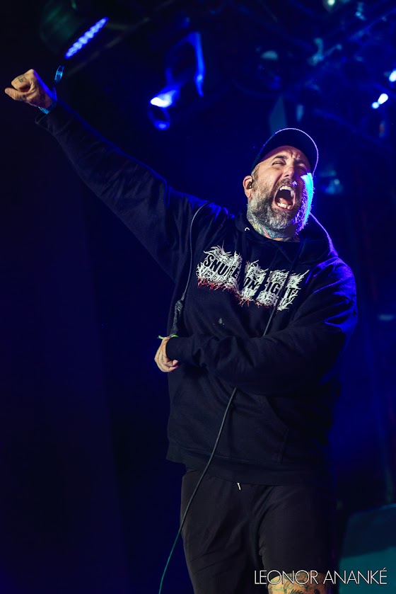 On abandonne donc très vite les cinq pitres tout de blanc vêtus pour se déporter de quelques dizaines de mètres à gauche et attendre bien gentiment, dans l’Altar, le concert des imbéciles heureux de The Acacia Strain. On ne les avait jamais vus, et on ne peut désormais que vous conseiller de courir les voir dès que vous en aurez l’occasion. Sans grand intérêt sur disque (bien que le solide diptyque Step Into The Light/Failure Will Follow, sorti en 2023, relève le niveau de leur dispensable discographie), la recette bovine des bostoniens fonctionne incroyablement bien en scène : les moshparts s’empilent les unes sur les autres, formant autant de coups de boutoirs abrutissants qui ont le grand mérite de parfaitement nous mettre en jambes, puisqu’on peut enfin se livrer à nos premiers circle-pits du séjour. Le son est excellent, Vincent Bennett est aussi volubile et bienveillant entre les morceaux qu’il est impitoyable durant ceux-ci, et la grosse demi-heure de concert nous donne l’impression de filer en quelques instants, ce qui est toujours bon signe. Tout cela ne nous donnera pas nécessairement l’envie de nous replonger dans leur riche mais éreintante discographie, par contre, force est de reconnaître qu’on passe un excellent moment, et que The Acacia Strain est la définition même du « groupe de scène ». On les reverra avec plaisir si l’occasion se présente.