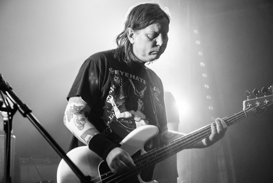 Trio composé du guitariste Craig Clouse (Shit & Shine, Todd), du batteur King Coffey (Butthole Surfers) et du bassiste Nate Cross (Water Damage), USA/Mexico monte sur les planches après l’excellente prestation électro-vocale-mentale et post-industrielle de Romain Simon/Carte Noire (et celle un peu plus tâtonnante de la formation rock expérimentale Donna Candy). La direction nettement doom/sludge du groupe surprend presque dans un tel contexte et on a droit pendant de longues minutes à un long cérémonial de riffs plombés et de cognements de batterie pachydermique qui remettent immédiatement à l’esprit la déflagration continue des trois albums du groupe (Laredo, Matamoros, Del Rio). De temps en temps, Clouse vient pousser quelques vocalises gutturales, histoire d’ébranler les fondations de cette plongée électrisée quelque part entre Sunn O))), The Melvins et The Body. Puis survient le dernier morceau, « Bullets For Pussy », tiré de Laredo, et tout s’éclaire d’un coup. Sous les affres de la mélodie vacillante du titre, semblant davantage extirpée des relents coldwave glauque de The Cure ou gothique barbiturique de Bauhaus, l’atmosphère émotionnelle du concert monte d’un cran. La voix subitement plus perceptible aspire la tension, les riffs plus chaloupés redéfinissent le concept d’hypnose et les harmonies diaboliques, surgissant en filigrane, laissent tout le monde un peu médusé quand les lumières se rallument.