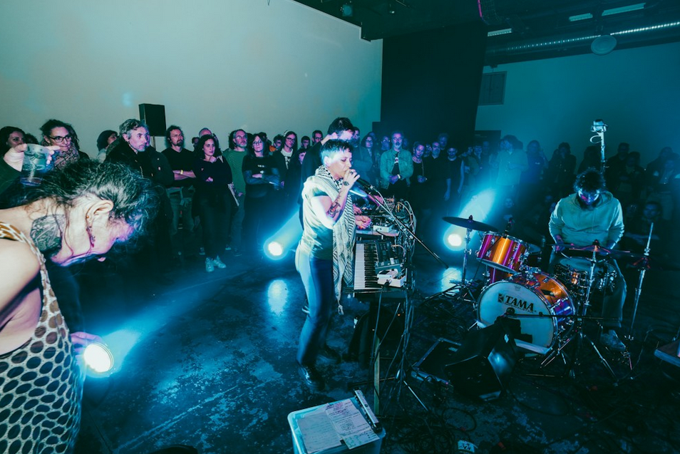 À sa façon, le groupe de Leeds donnait déjà un petit manuel d’emploi de la formule DIY de Sonic Protest à venir : un axe musical brut de décoffrage, mais laissant tout de même la place à toutes les formes expressives possibles, bruitistes et minimalistes, musicales et débridées, alambiquées et épurées. Pour preuve, Sonic protest 2024 a particulièrement fait la part belle cette année à des propositions sonores déployant tout un arsenal d’instruments et d’instrumentations bricolées en quête de narrations folkloriques imaginaires. Au théâtre Berthelot de Montreuil, l’ensemble Nist-Nah, mené par le batteur australien Will Guthrie autour d‘une refonte et d’une réécriture collective de la densité métallisée du gamelan indonésien, dévoile ainsi un fourmillement de détails sonores et visuels derrière la rigueur et la précision millimétrique des musiciens en proie à leur folie percussive. À La Muse en Circuit d’Alfortville, on se laisse prendre par le chant captivant, proche d’un véritable bourdon, d’Arthur Chambry, et par ses instruments inventés (cornemuse dorsale maison à pompe à bras, machinerie à bases de tubes et tuyaux PVC) venant célébrer à grands coups de sabots une musique pastorale à relier aux univers d’artistes comme La Tène ou Yann Gourdon. Cette manière de remettre la tradition au cœur de processus électroacoustiques, parfois incongrus, parfois loufoques, mais toujours créatifs, demeurera un axe fort de Sonic Protest.